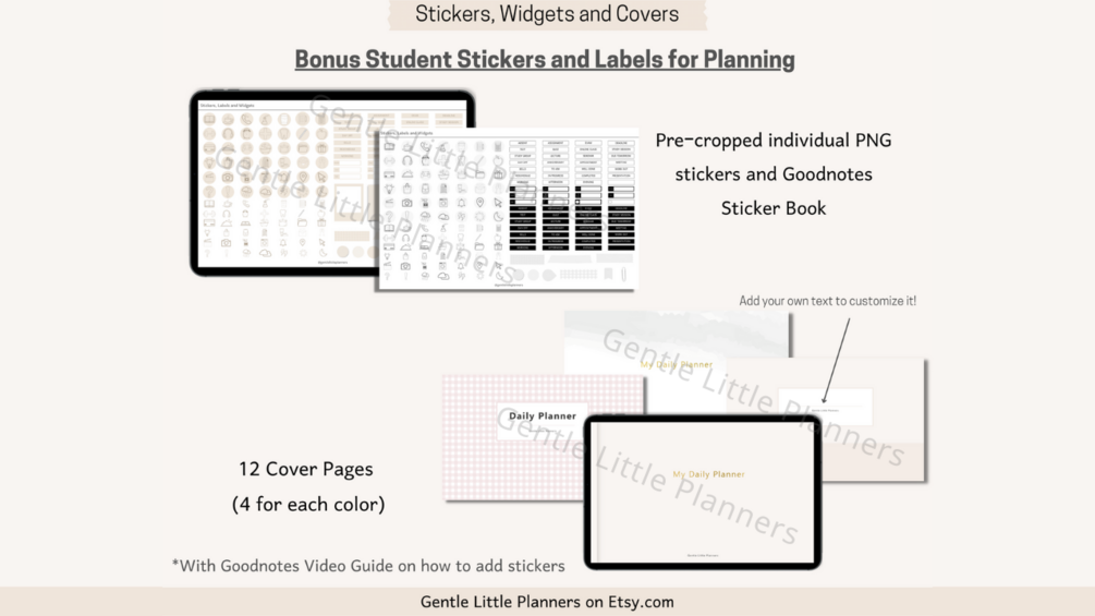 - Pre-cropped student stickers and Goodnotes file sticker book, cover pages (3 customizable covers)