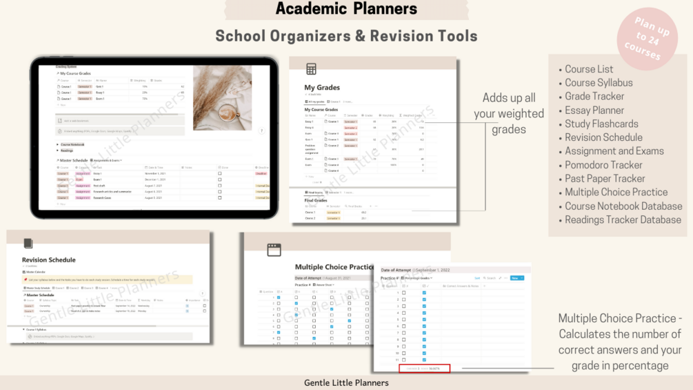 Semester Timetable, Course list, Course planners, Grade Tracker, Assignment and exam planner, Essay planner, Study flashcards