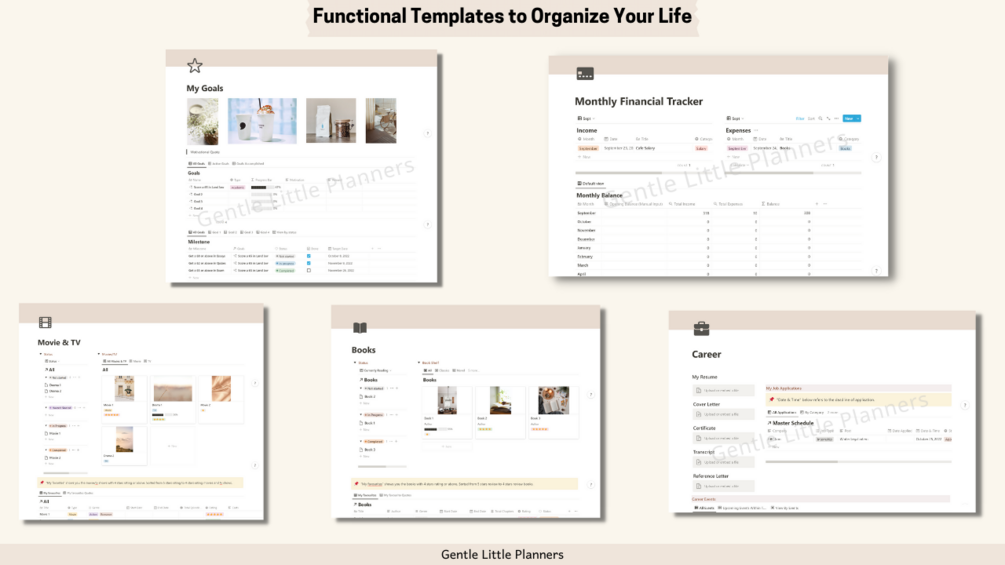 Goal planner, Job application tracker and interview questions planner, Monthly Financial Tracker and wish list, Books and quote list, Movie/TV and quote list