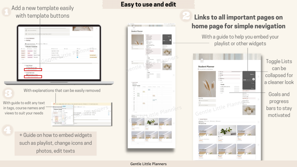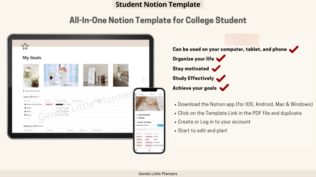 This template is easy to use and edit. We have included notes on how to use the planners, and a step-by-step PDF guide on how to edit your planners. Download this beige aesthetic notion template to stay super organized this school year now!